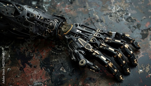 Craft a high-tech, modular prosthetic hand with intricate mechanisms and adjustable features, showcasing a seamless integration of human anatomy and advanced technology