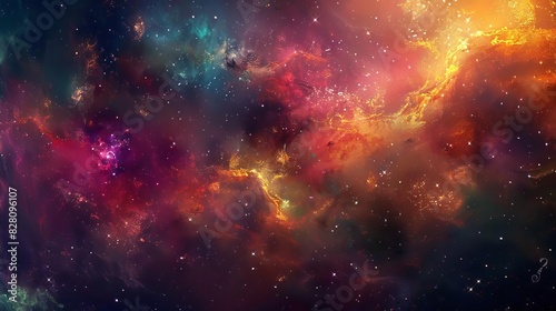 Craft a striking image of a vast galaxy swirling with colorful nebulae and shimmering stars, merging seamlessly with intricate musical notes Combine traditional oil painting techniques with digital CG