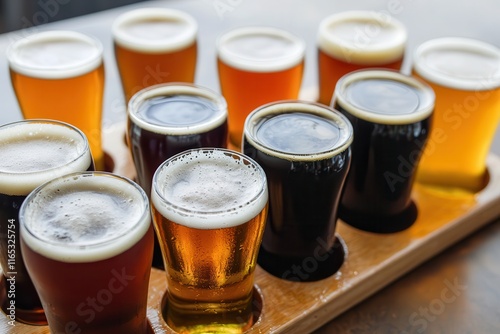 Craft beer delights with rich aroma. Assortment of craft beers in a flight tray.