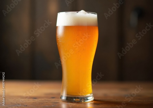 Craft beer served in a glass on a wooden table in a cozy bar setting