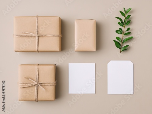Crafted gift boxes with twine, blank cards, and a green leaf on a neutral surface, ideal for celebrations and special occasions.
