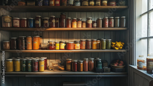 jar, preserving, fruit, vegetable, shelf, kitchen, cosy, rustic, produce, storage, pantry, sunlight, organic, homemade, colourful, glasses, lemon, apple, heritage, food, culinary, harvest, season, collection, healthy, natural, ingredient, decor, arrangement, detail, craft, simple, artisanal, vibrant, kitchen utensile, nourishment, interior, ambience, countryside, warmth