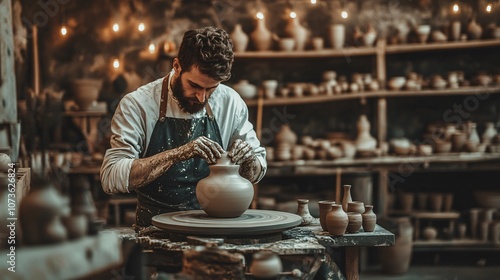 pottery, craftsman, artisan, potter, workshop, studio, clay, wheel, shaping, molding, ceramic, art, craft, hand, beard, apron, tool, traditional, skill, creative, sharpened, dedication, hand-made, earthenware, craftsmanship