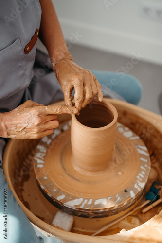 apron, art, ceramist, clay, craftsman, crop, earthenware, rim, rotate, shape, vase, wet, workshop
