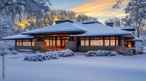 Craftsman style home with snow covered roof and frosty windows on a peaceful winter morning