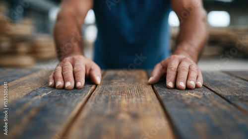 Craftsman with strong hands carefully inspects rustic wooden table surface, focusing on texture and quality in workshop environment, evoking dedication and skill