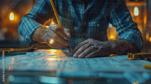 craftsman, workshop, blueprint, crayons, drawing, hand, closeup, sharpened, work, design, construction, engineering, architecture, plan, project, tool, measurement, precision, detail, skilled, expert, concentration, light, warm, glow, table, paper, line, grid, scale, professional, craft, metal, ruler, wood, goggles, shadow