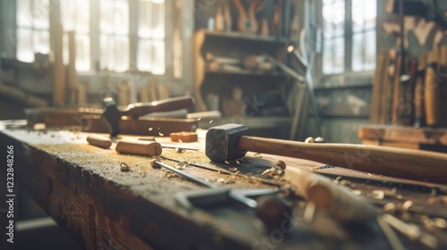 Craftsmanship in Action: Hammer and Tools in a Traditional Carpenter's Workshop