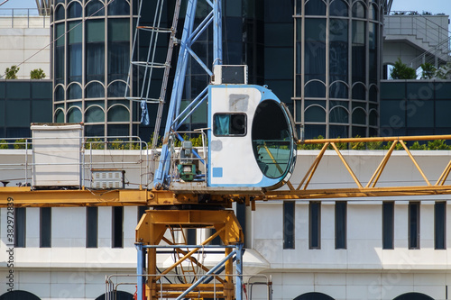 crane, operator, cabin, against, white, building, construction, equipment, site, heavy, machine, men at work, machinery, hook, safety, protection, vehicle, work, control, loading, industrial, architecture, industry, mover, lift, lifting, load, manual, metal, modern, project, high, scaffolding, steel, structure, tall, technology, business