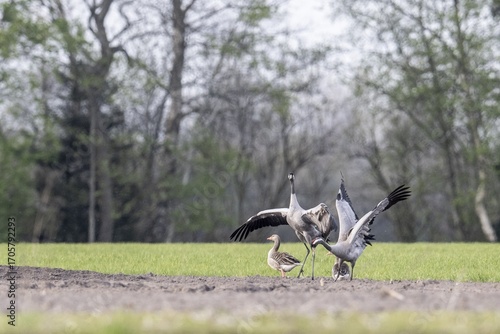Cranes (Grus grus), dancing, Emsland, Lower Saxony, Germany