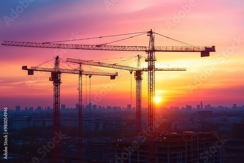 Cranes operating at sunset over a construction site for new residential buildings and urban infrastructure with a blurred effect