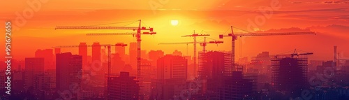 sunset, city landscape, construction, crane, silhouette, vibrant, sky, capture, urban, development, home, freezed, real, builder, growth, investor, symbol, progress, wreck, crisis, crumbled, sorrowful, waste, ruin, bankrupt
