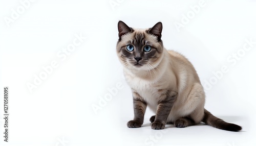Cream and Gray Cat with Striking Blue Eyes on White Background