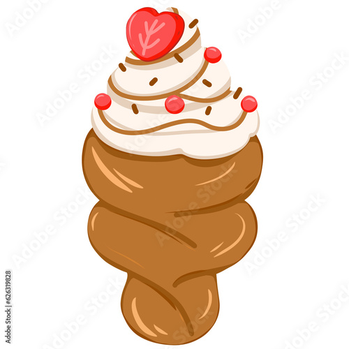 Cream horn with brown puff pastry, whipped cream, strawberries and chocolate. Look like ice cream cone.