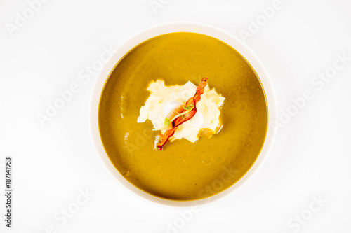 Cream of sorrel and green vegetables soup with quail egg, sour cream, mashed potatoes and crispy bacon on a white background