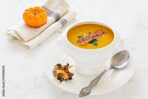 cream soup from vegetables of a pumpkin, a leek, carrots with a Parmesan, mushroom and bacon, a parsley in a white soup plate. still life covered table view from above.