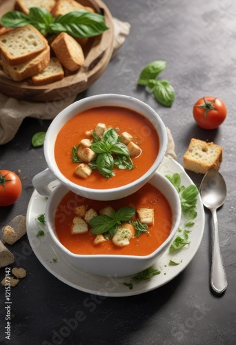 creamy and rich tomato soup with croutons and basil, indulgent, rich, velvety