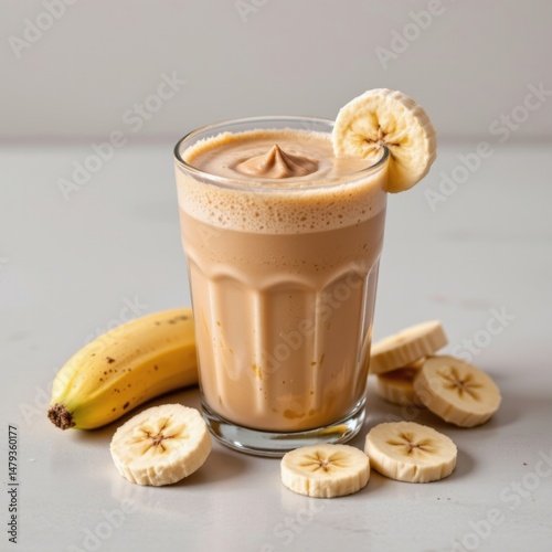 Creamy banana and chocolate smoothie in a glass garnished with banana slices and a banana-flavored dessert on a light background