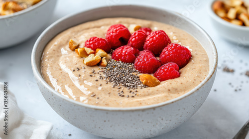 Creamy bowl of overnight oats topped with fresh raspberries, nuts, and chia seeds, perfect for