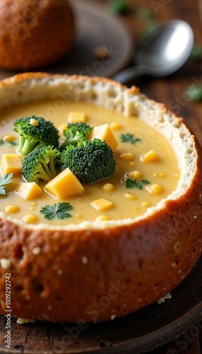 Creamy broccoli cheese soup served in a bread bowl, comforting and hearty meal