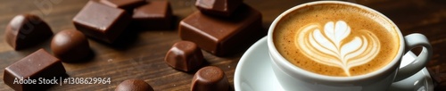 Creamy cappuccino, rich chocolate candies overhead , creamy, warmth