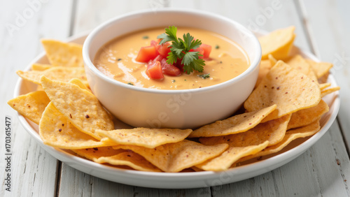 Creamy cheese dip served in bowl, surrounded by crispy tortilla chips, garnished with fresh cilantro and diced tomatoes, perfect for snacking
