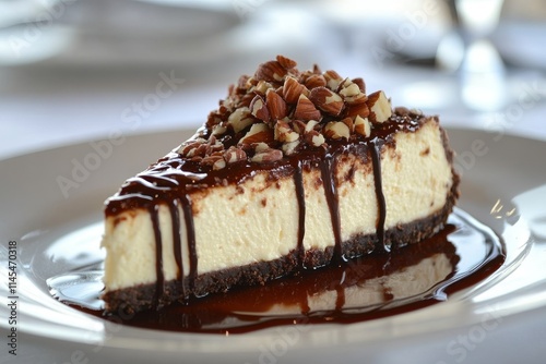Creamy cheesecake slice, drizzled with chocolate and topped with almonds. Perfect for menus, blogs, or dessert-themed content.