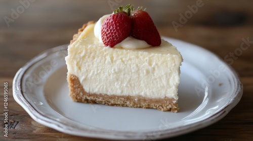 Creamy cheesecake slice, strawberries, wooden table. Food photography for recipe websites