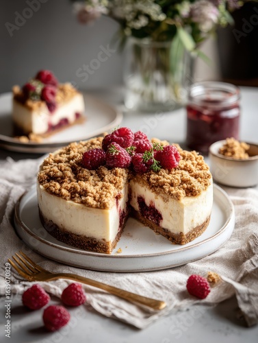 Creamy cheesecake with raspberry layer and golden crumble topping, ideal for food blogs, magazines, food recipes, cookbooks, food advertising, food styling