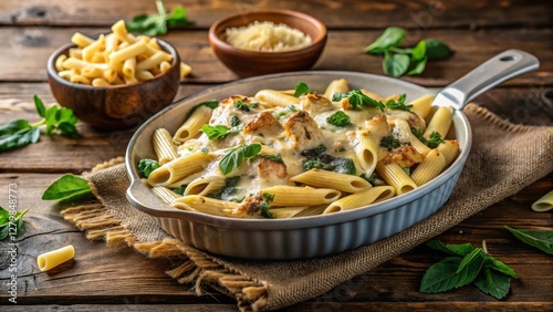Creamy Chicken and Spinach Penne Pasta Bake in a Rustic Setting