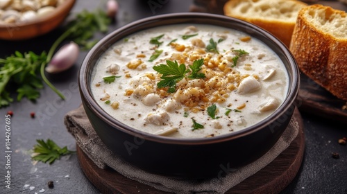 soup, chicken, creamy, herb, bowl, bread, fresh, ingredient, food, cooking, savoury, meal, comfort, tasty, seasoning, parsley, garlic, onion, garnishing, healthy, delicious, culinary, rustic, kitchen, homemade, broth, garnish, presentation, nourishment, flavorful, hearty, dish, dinner, table, receipe, appetising, cookery, snack, organic, warm, cosy, pea, decor