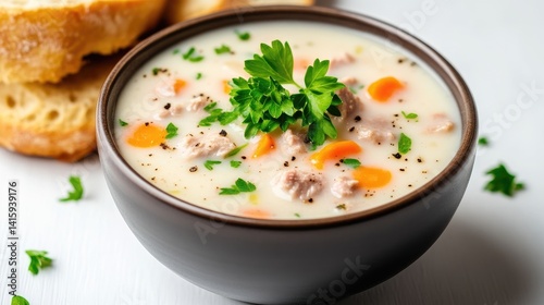 soup, creamy, chicken, meat, vegetable, comfort, hearty, delicious, hot, lunch, dinner, easy, simple, receipe, healthy, vegan, vegetarian, diet, alimentary, nourishing, protein, fiber, calorie, fat, carb, appetising, tasty, flavorful, quick, cheap, affordable, eatery, homemade, food, bowl, bread, parsley, carrot, meal