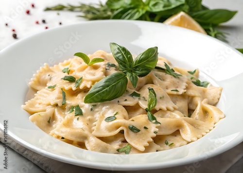 Creamy Farfalle Pasta with Fresh Basil on Minimal White Plate