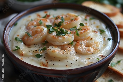 shrimp, meat sauce, creamy, garlic, rustic, soup, epicure, herb, spice, dining, ceramic, bowl, seafood, broth, culinary, presentation, dish, meal, dinner, lunch, receipe, comfort, food, cooked, fresh, delicious, texture, herbal, garnished, savoury, favor, artisan, tasteful, homemade, dinnerware, seasoning, pepper, parsley, cookery, delicacy, nourishment, traditional, kitchen, warm