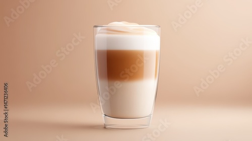 Creamy latte in clear cup, frothy milk topping, warm colors enhancing cozy vibe, perfect for cafe or breakfast settings.