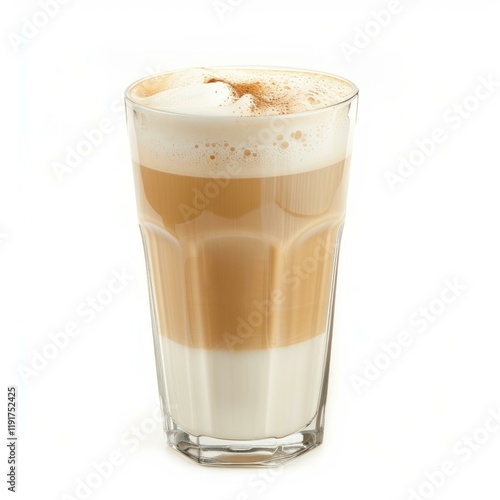 Creamy latte macchiato coffee topped with cinnamon, served in a tall glass, creating a visually appealing beverage against a clean white backdrop