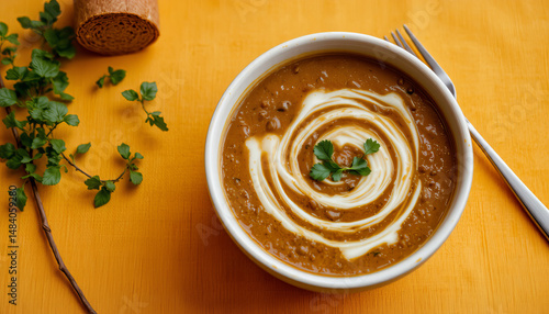 Creamy lentil soup with swirl of cream and fresh herb on wooden table