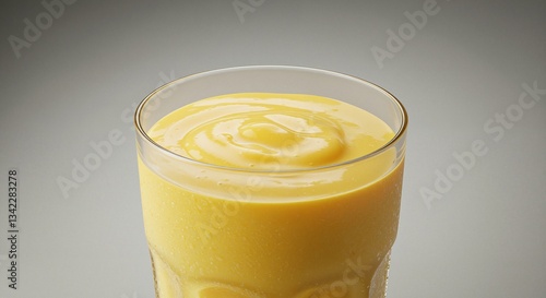 Creamy mango smoothie in a clear glass with a smooth surface and rich golden color, evoking a fresh and tropical vibe
