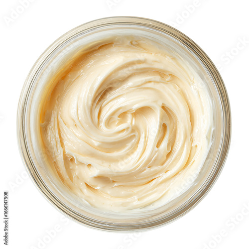 Creamy mayonnaise swirl in glass bowl top view on transparent background