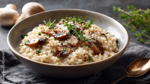 risotto, mushroom, cream, herb, bowl, food, dish, garnish, thyme, spoon, table, meal, cooking, cookery, vegetarian, comfort food, aromatic, seasoning, presentation