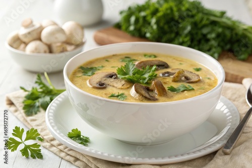 mushroom, soup, creamy, fresh, herb, rustic, table, culinary, kitchen, comfort, food, garnished, homemade, delicious, mushroom, cilantro, receipe, warm, meal, ingredient, cooking, savoury, vegetarian, presentation, cosy, dining, bowl, dish, art, healthy, eating, easy, texture, flavorful, seasonal, epicure, colours, styling, aromatic, life events