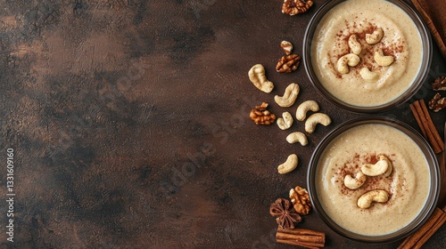Creamy Nutty Dessert in Bowls with Cashews, Walnuts, Cinnamon, and Chocolate on Rustic Table