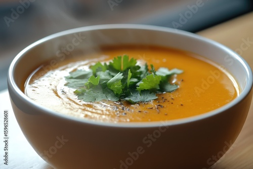 Creamy orange soup garnished with fresh cilantro, a warm and comforting meal.