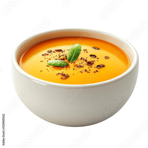 soup, pumpkin soup, soup bowl, white bowl, garnish, herb, spice, pepper, basil, seed, food photography, delicious, appetising, healthy, comfort food, warm, vibrant, orange color, white color, smooth, closeup, studio shot, culinary, receipe, cooking, meal, dinner, lunch, autumn color, seasonal, tasty, food and drink, eatery, home cooking