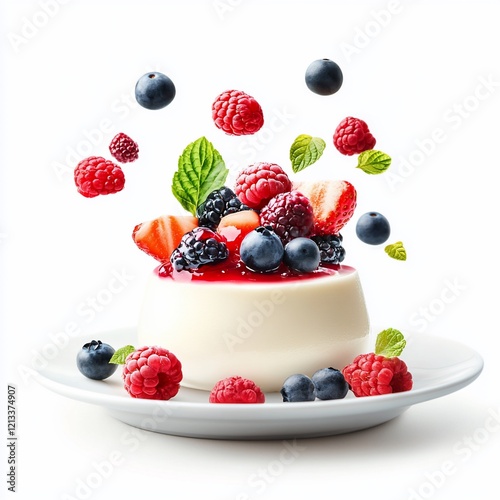 Creamy panna cotta dessert topped with fresh berries and mint.