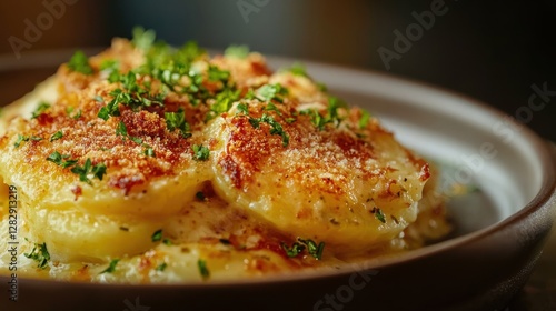 potato, gratin, creamy, cheesy, parsley, casserole, baked, dish, food, cookery, dinner, lunch, dinner, meal, delicious, savoury, comfort, culinary, receipe, cooking, kitchen, oven, home, eatery, deliciously, tasty, flavorful, appetising, gold, brown, herb, spice, dairy, plate, bowl, closeup, texture