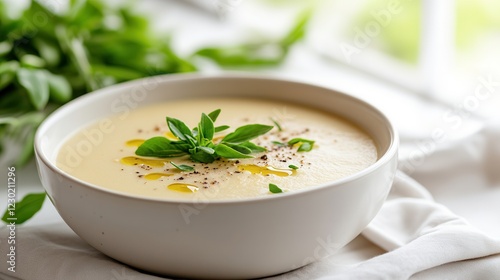 creamy, potato, soup, basil, garnish, bowl, white, elegant, fresh, herb, cookery, meal, delicious, appetising, hearty, comfort, food, homemade, culinary, dish, healthy, nourishment, savoury, smooth, dining, lunch, dinner, epicure, classic, traditional, tasteful, aromatic, receipe, kitchen, cooking, broth, texture, wholesome, leafy, green, herbaceous