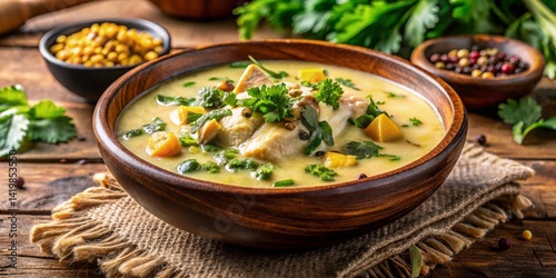 Creamy Poultry Stew with Root Vegetables and Herbs in a Rustic Wooden Bowl