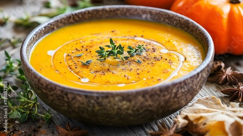 pumpkin, soup, creamy, autumn, culinary, delight, fall, seasonal, harvest, delicious, tasty, flavorful, comforting, warming, healthy, vibrant, orange, spice, thyme, pepper, ginger, star, anise, bowl, wooden, table, rustic, food, photo, cooking, receipe, dinner, lunch, meal, vegetable, gourd, smooth, rich, thick, hearty, garnish, aroma, fragrance, winter
