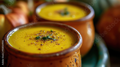 Creamy Pumpkin Soup in Rustic Bowls Garnished with Fresh Herbs